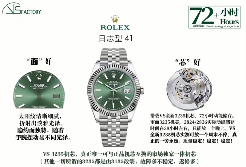 1,搭载VS全新3235机芯,市面3235机芯,2824/2836实际动能储存时间在38小时左右,只能放一个晚上。VS全新3235机芯实测可放一个周末不停,真正的一劳永逸。