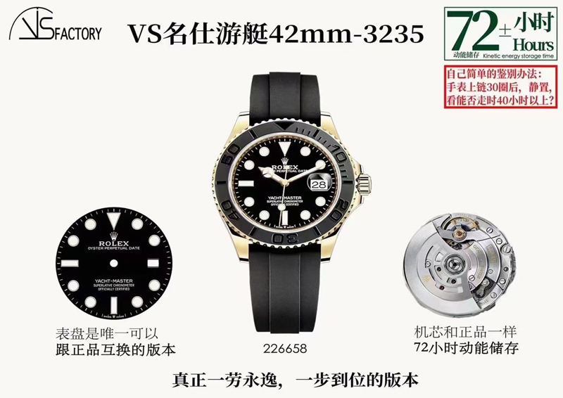 VS厂劳力士顶级复刻表黄金游艇直径42M,哑光的黑色表盘,复刻表黄金游艇丹东3235机采用电镀18K金包裹的Chromalight,超强夜光涂层,搭载VS工厂独家研发一体机丹东3235机芯,储存动能可达到72小时+。