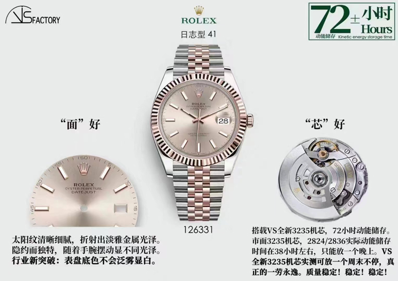 VS厂手表官网2023年新款:VS厂复刻表劳力士香槟色126331日志丹东3235机芯41M日志型;VS厂丹东一体3225机芯,唯一72动能储存版本。而且质量稳定,几乎不用返修售后。