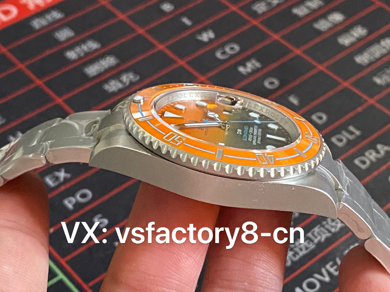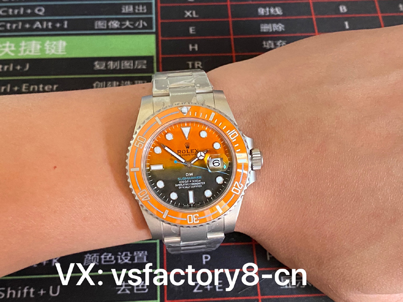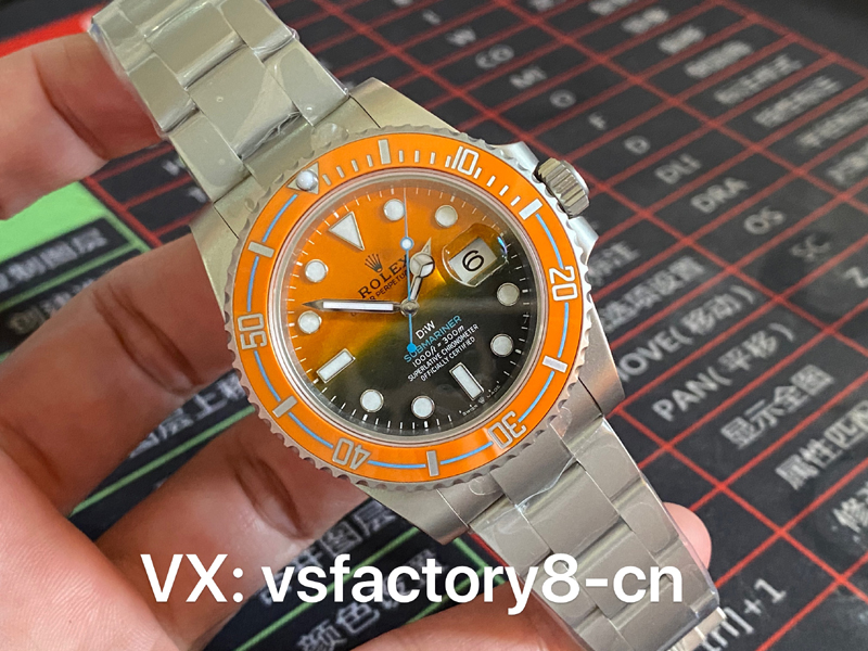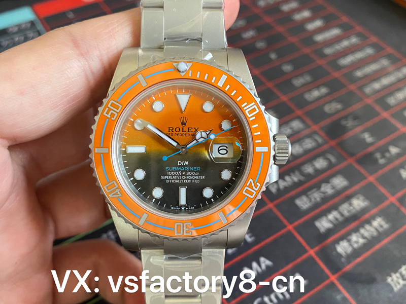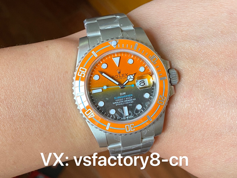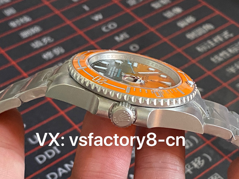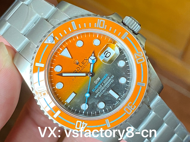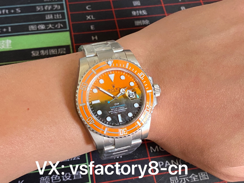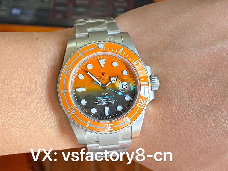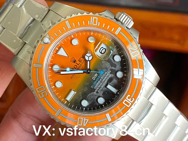 3,VS厂DIW劳力士水鬼 40mm直径,精钢PVD电镀喷砂,旋转橙色陶瓷外圈 搪瓷渐变橙盘面,旋入式表冠, 旋入式底盖,丹东3135一体机芯。黑洞玻璃 ,支持游泳潜水;