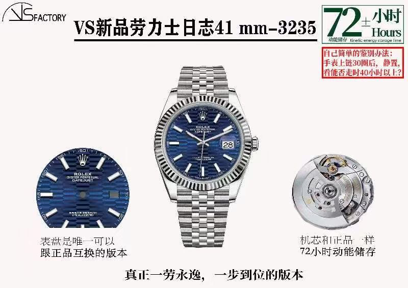 VS厂手表官网2023年最新款顶级复刻表劳力士丹东3235机芯41M日志型DJ格子纹蓝,VS厂独家研发丹东3225一体机芯,唯一72小时动能储存版本。而且质量稳定,几乎不用返修售后。VS厂劳力士顶级复刻表最简单的鉴别办法:手表上链30圈后,静置,看能否走时40小时以上?自己就能鉴别版本,不用担心买到小厂冒充货。VS厂劳力士日志格子纹904L壳套,最新的字面套件,细节近乎完美了,细节,机芯一步到位。可以闭眼入手。
