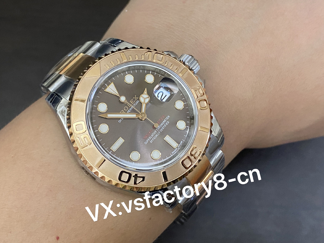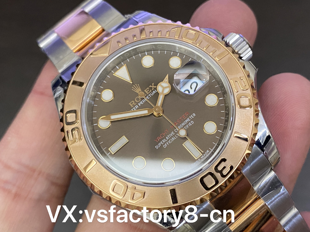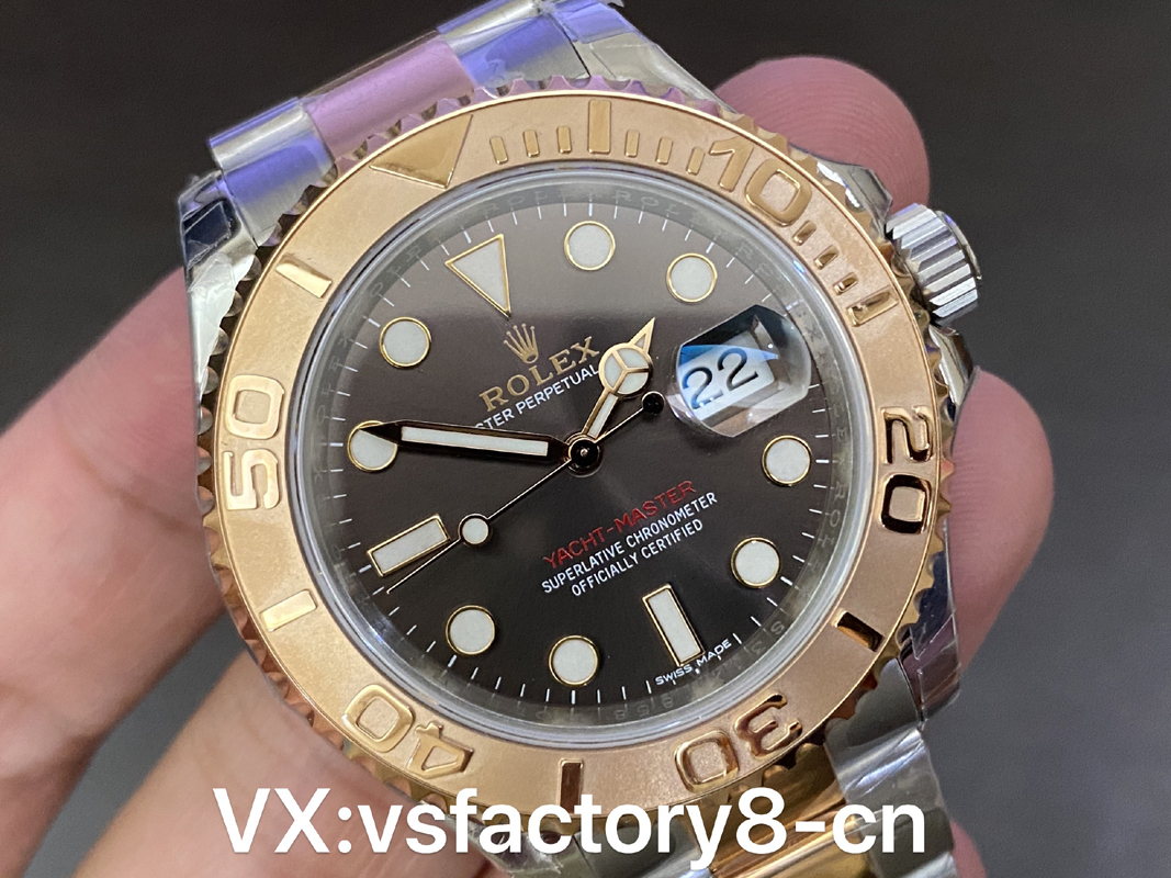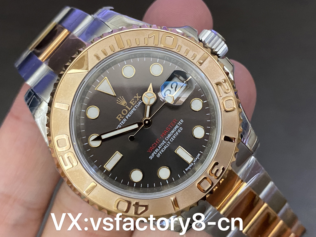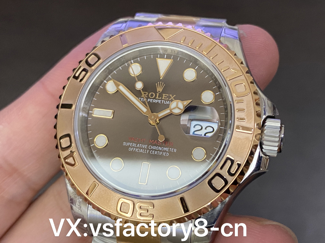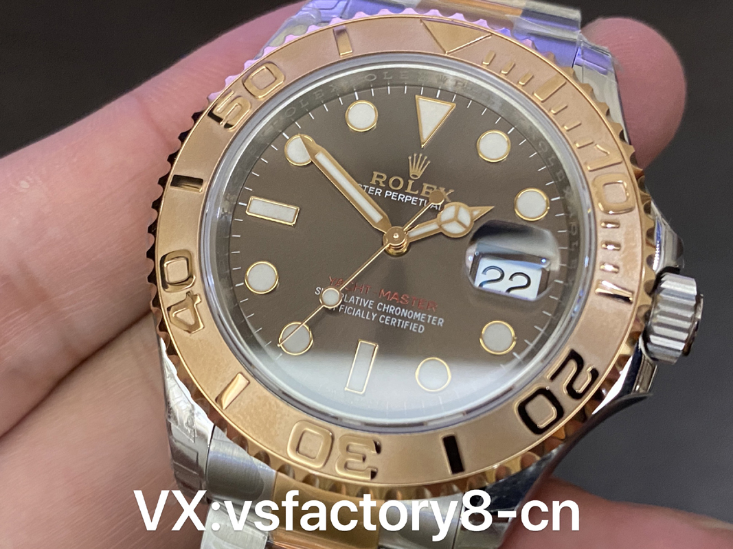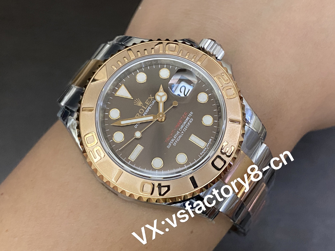 VS厂游艇玫瑰金巧克力复刻表的表壳侧面纤薄修长、抛光效果闪耀靓丽,锁头护肩凹凸有致线条坚挺柔和;表圈磨砂独特、表盘暖阳放射!