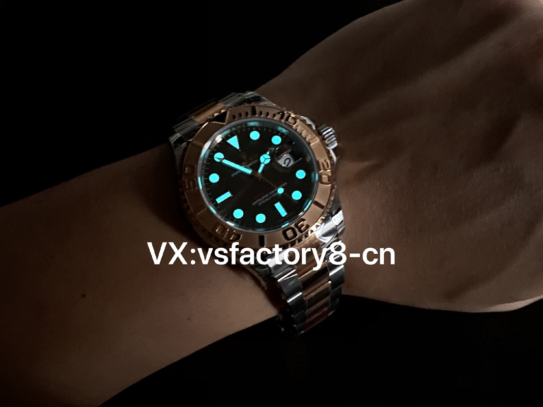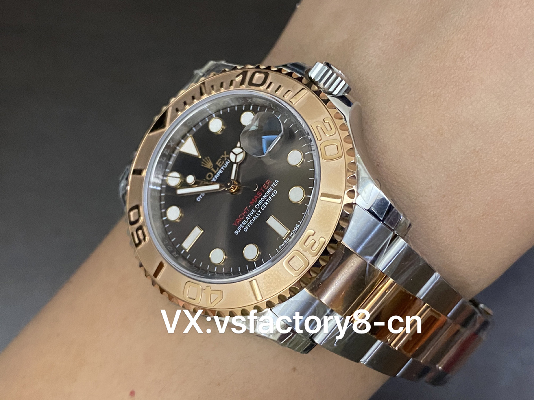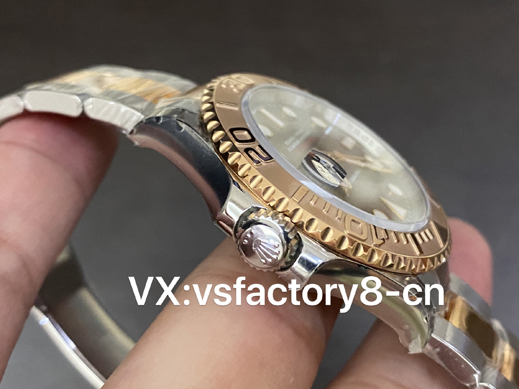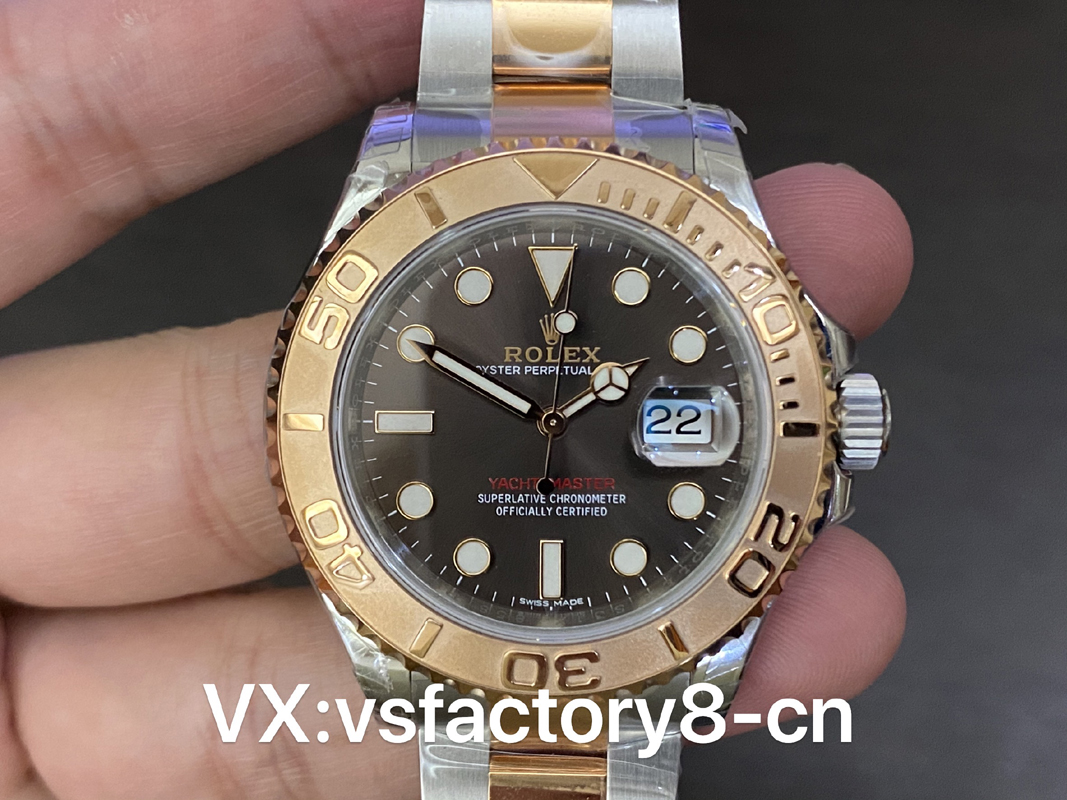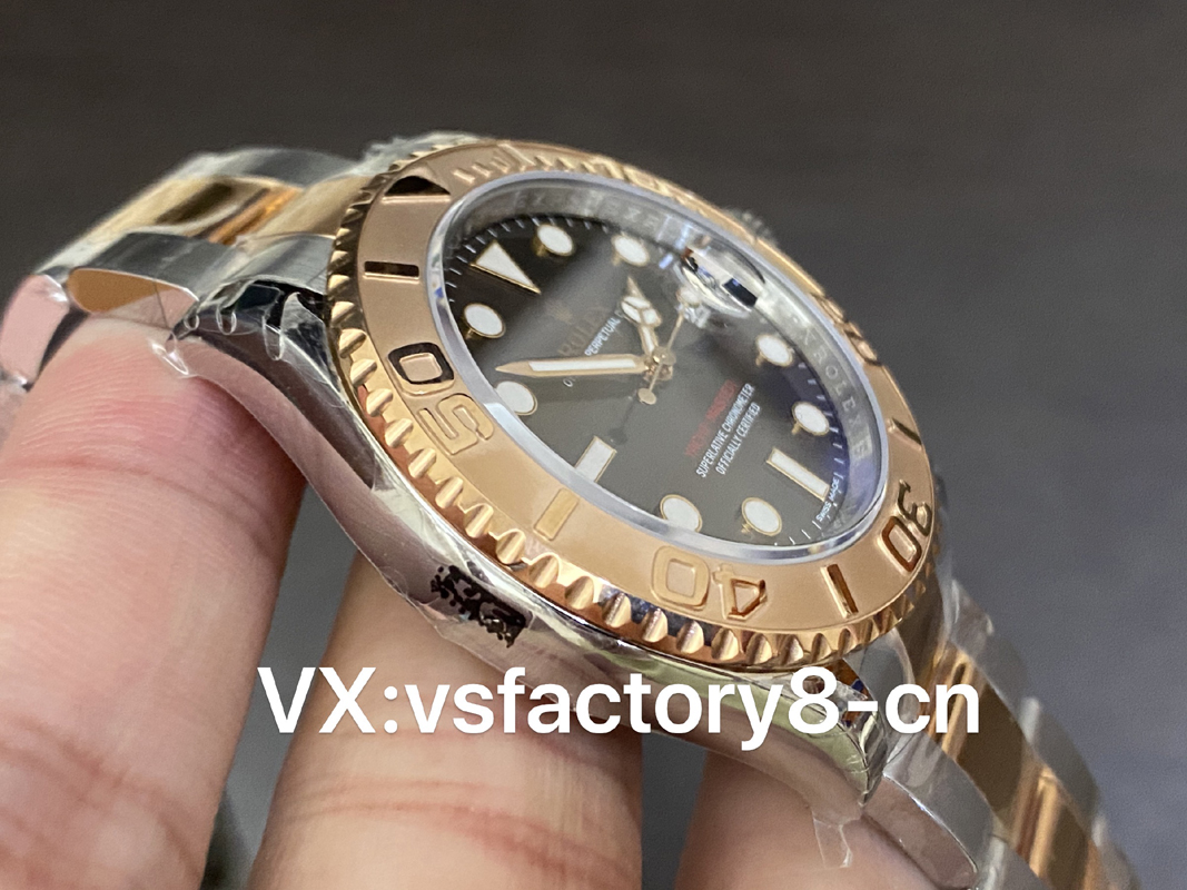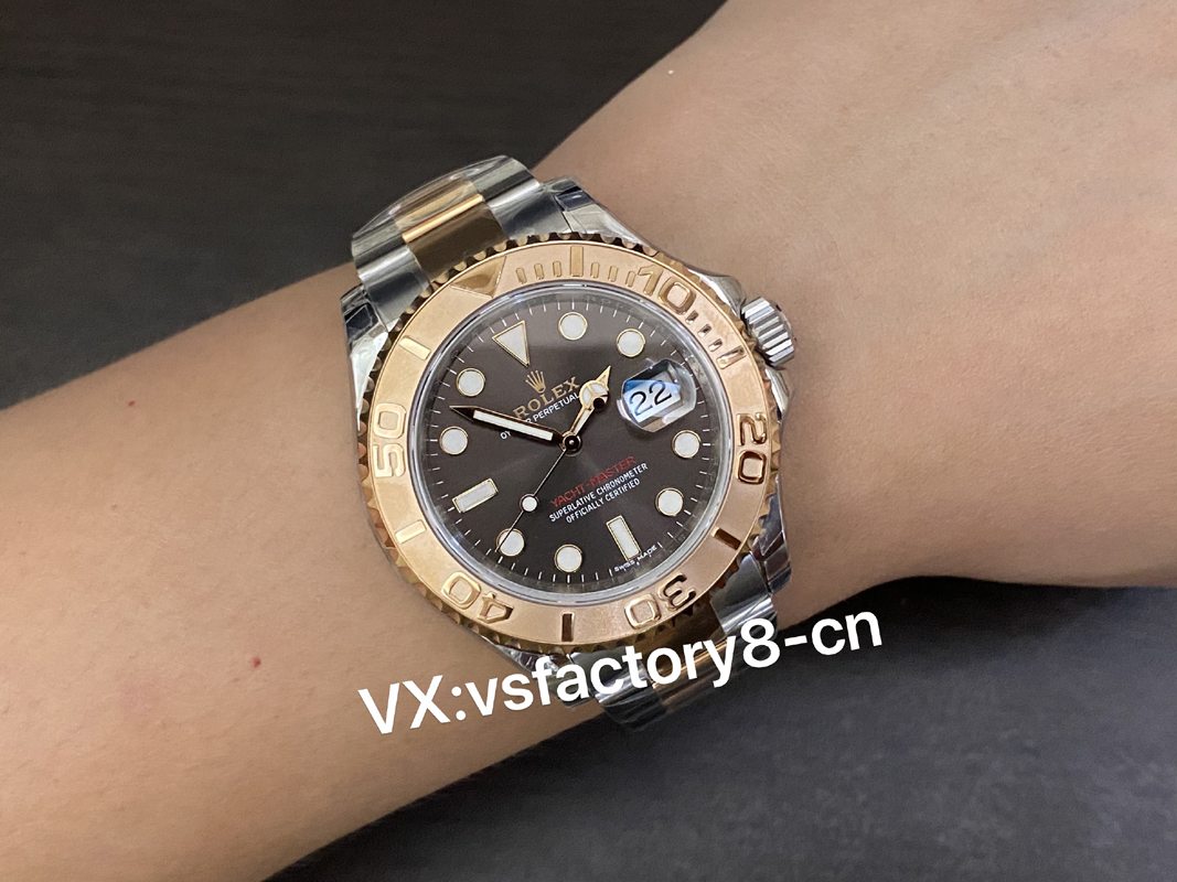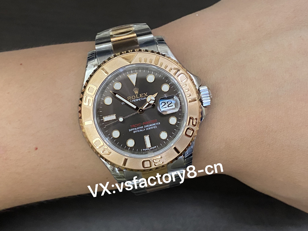 VS厂游艇玫瑰金巧克力复刻表的表壳侧面纤薄修长、抛光效果闪耀靓丽,锁头护肩凹凸有致线条坚挺柔和;表圈磨砂独特、表盘暖阳放射!