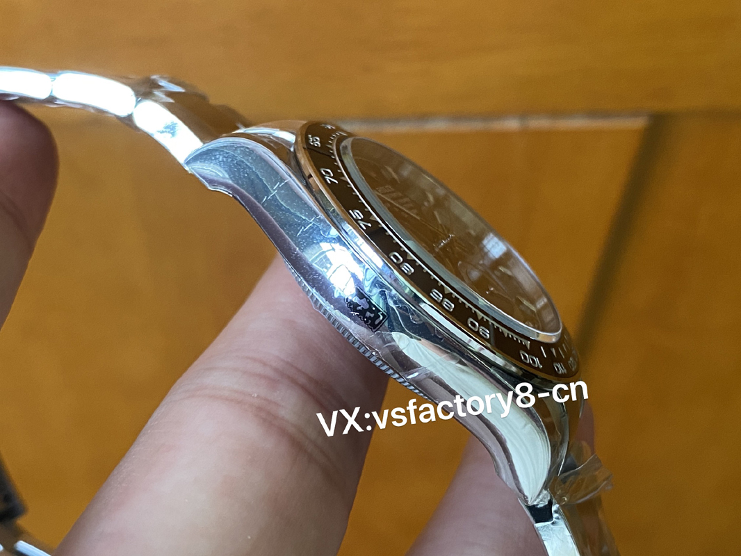 通过图片对比大家比较关注的点表盘的三个银色小圈,VS厂迪通拿黑陶迪4131机更新最大的部分,小圈边缘多了一个亮圈,这点VS厂官网做的很好,斜度、亮度。但是银灰色的小圈,我个人觉得底纹相对于真品还不是那么细腻,但是肉眼不可见,具体可以看自然光对比。