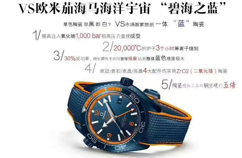 VS厂官网新品:太难了!蓝陶瓷!VS厂手表研发一年,独家突破一体蓝陶瓷。实在太难了,仅此一批!单色陶瓷盛行白、黑、灰。蓝陶瓷腕表实在罕见,VS厂手表官网运用陶瓷原料(氧化锆)添加颜料,模具注入氧化锆1000bar压力成型,20000摄氏度炉子3小时等离子烧结,烧结成型后将无法后期加工,一次成型,烧结后变色、颜色不均匀、沙孔、白点、直接报废!无法挽回!不良品太高了!导致无法量产。太难了!