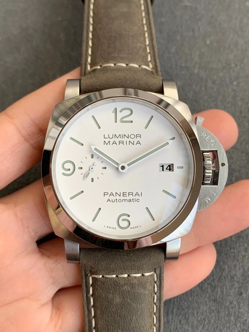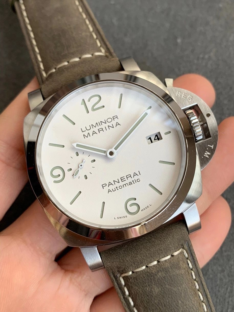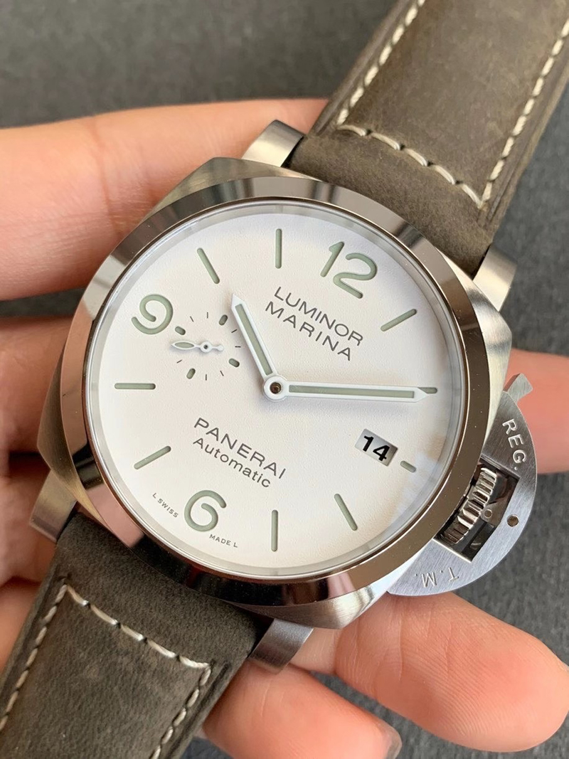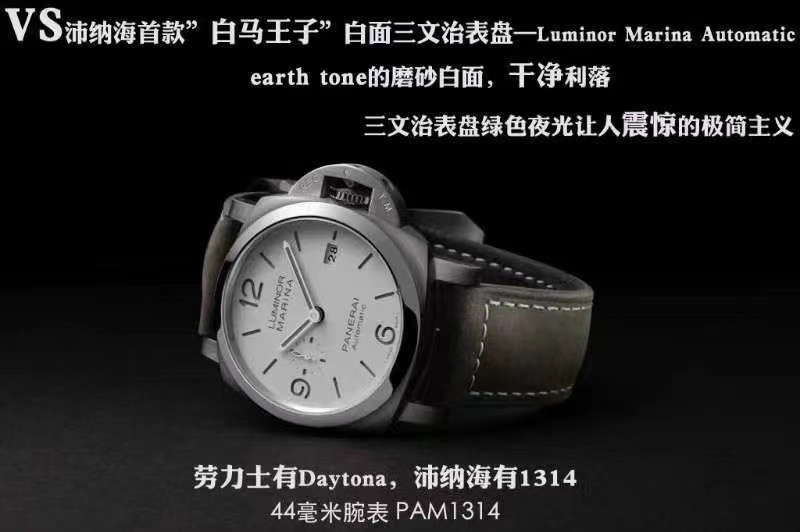 VS新品:沛首款“白马王子”44毫米PAM 1314 ,劳力有Daytona,沛呐海有1314,白色磨砂面盘,干净利落!三文治表盘绿色夜光让人震惊的极简主义! 尺寸:44M 机芯:P.9010 功能:时,分,秒,日期 壳套:精钢壳套 表蒙:防划蓝宝石水晶 表盘:白色表盘 表带:牛皮表带 表扣:针扣 防水:> 50米 标签:
