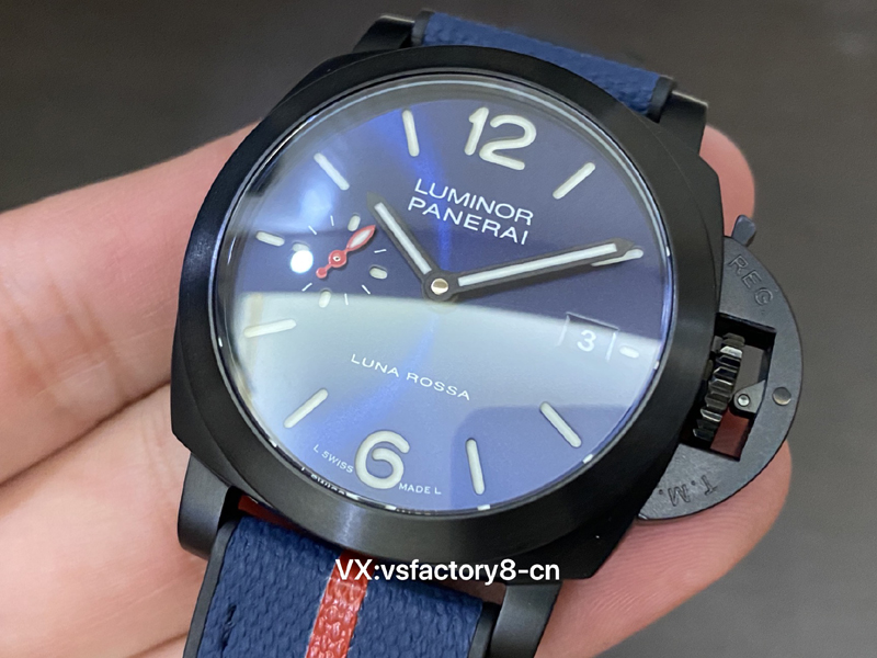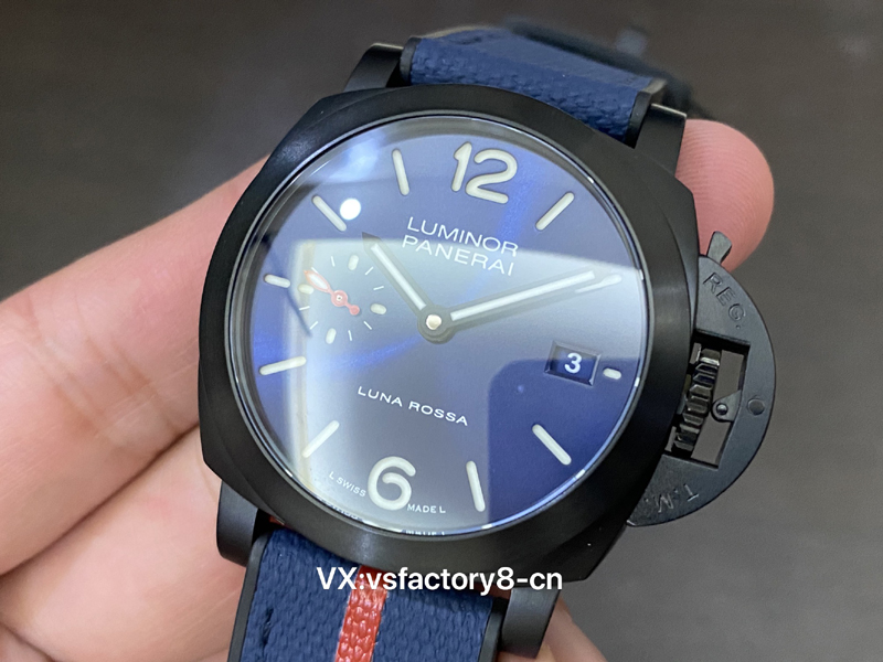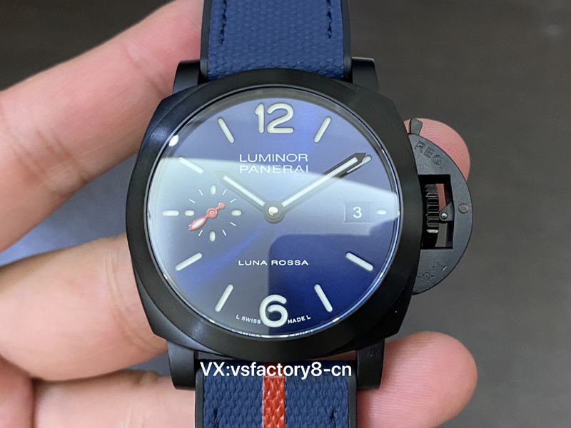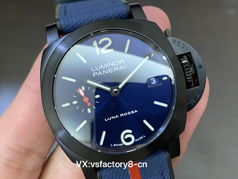 2024年八月份VS厂全新推出沛纳海PAM1048复刻腕表,VS厂还原一致正品沛纳海蓝色太阳放射纹表盘,夜光阿拉伯数字及小时标示;3点钟位置设日期显示;9点钟位置设小秒盘。 VS厂沛纳海1048复刻版采取正品一致全陶瓷表壳,防划痕,不褪色,不会旧;搭配VS工厂研发一体P.9011机芯,功能与原装正品一致! 尺寸:40M 机芯:Cal.P.900 功能:时,分,秒,日期 壳套:全陶瓷壳套 表蒙:防划蓝宝石水晶 表盘:蓝色表盘 表带:帆布蓝色表带 表扣:针扣 防水:> 50米 标签: